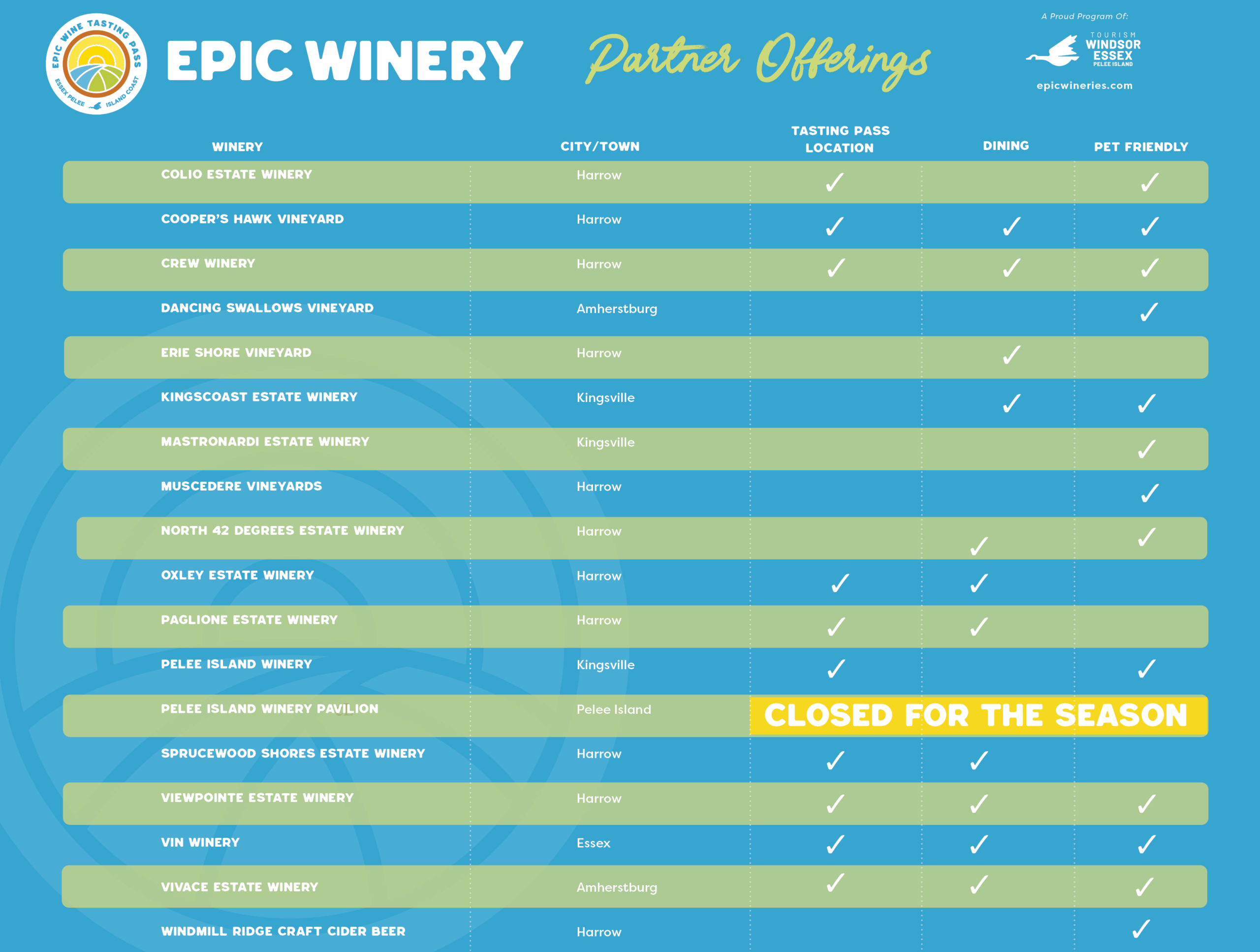 Use our handy grid below to plan your visits to EPIC wineries for tastings, patio service and indoor dining. When purchasing local wines be sure to visit their retail stores or order direct online through the winery websites to support our local EPIC Wineries and bring your favourite #YQG wines home tonight!